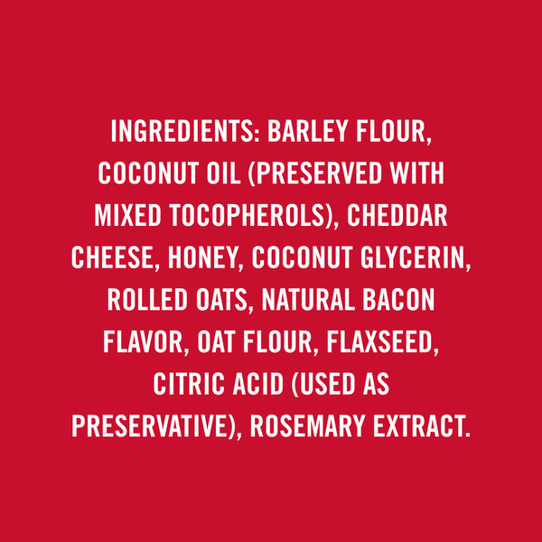 Ingredients: Barley flour, coconut oil (preserved with mixed tocopherols), cheddar cheese, honey, coconut glycerin, rolled oats, natural bacon flavor, oat flour, flaxseed, citric acid (used as a preservative), rosemary extract.