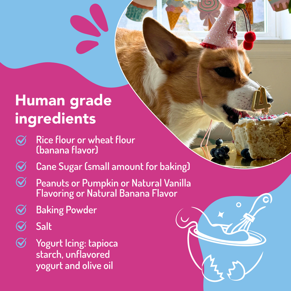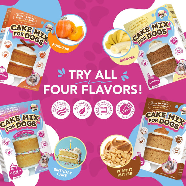 Puppy Cake dog birthday cake mix is available in a delightful array of flavors! From birthday cake to peanut butter, red velvet to carob, pumpkin, and banana, each mix is carefully crafted to deliver a taste sensation that will have dogs begging for more.