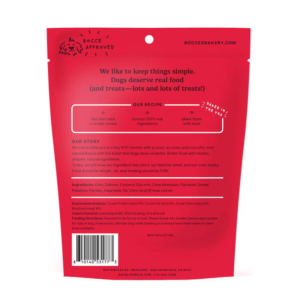 Ingredients: Oats, Salmon, Coconut Glycerin, Cane Molasses, Flaxseed, Sweet Potatoes, Parsley, Vegetable Oil, Citric Acid (Preservative) Guaranteed Analysis: Crude Protein (min) 13%, Crude Fat (min) 4%, Crude Fiber (max) 2%, Moisture (max) 18% Calories: 9 per treat